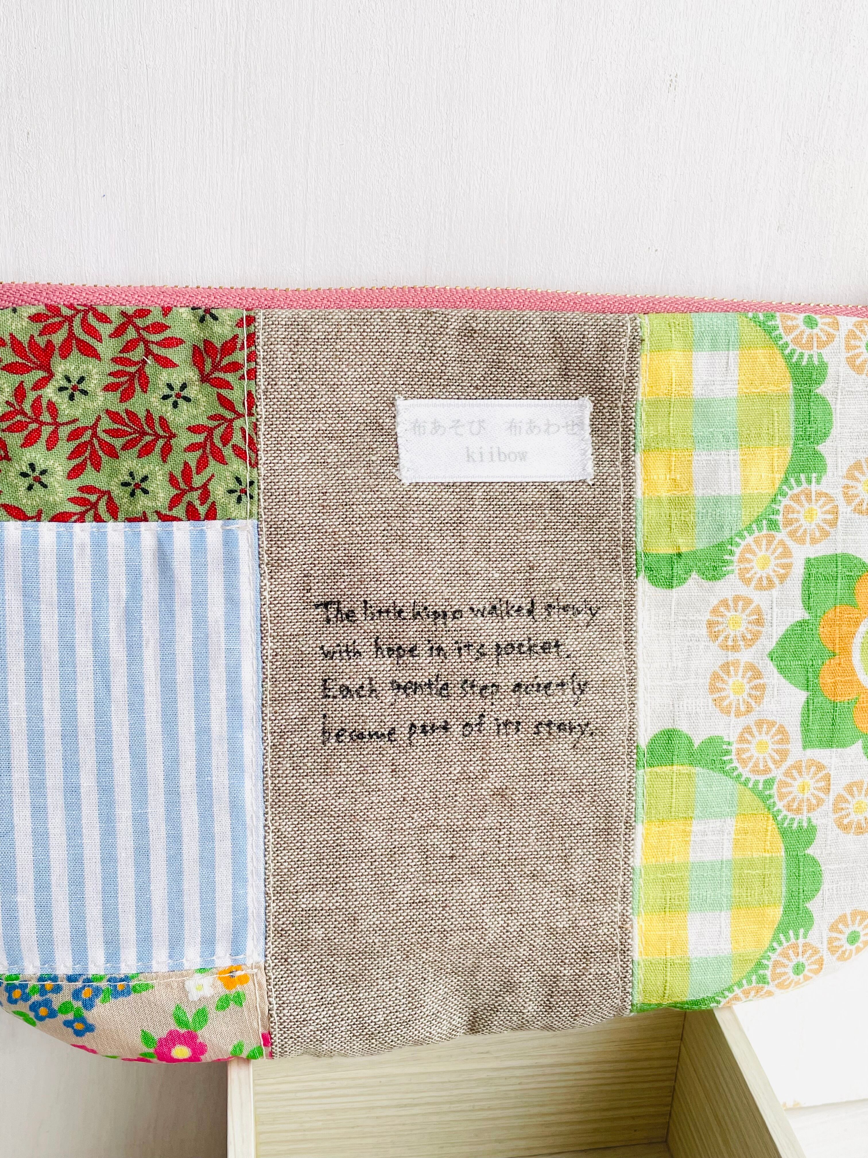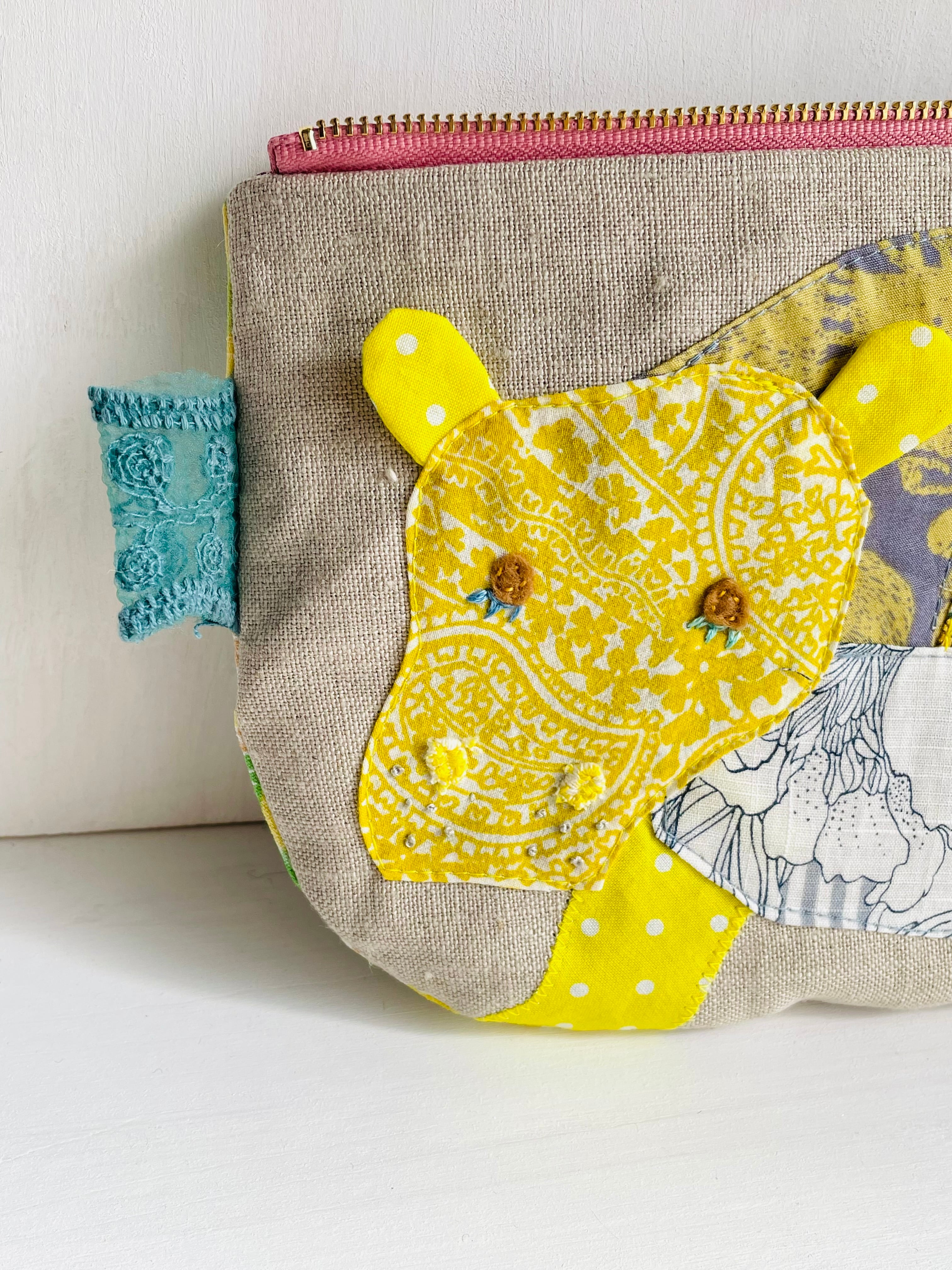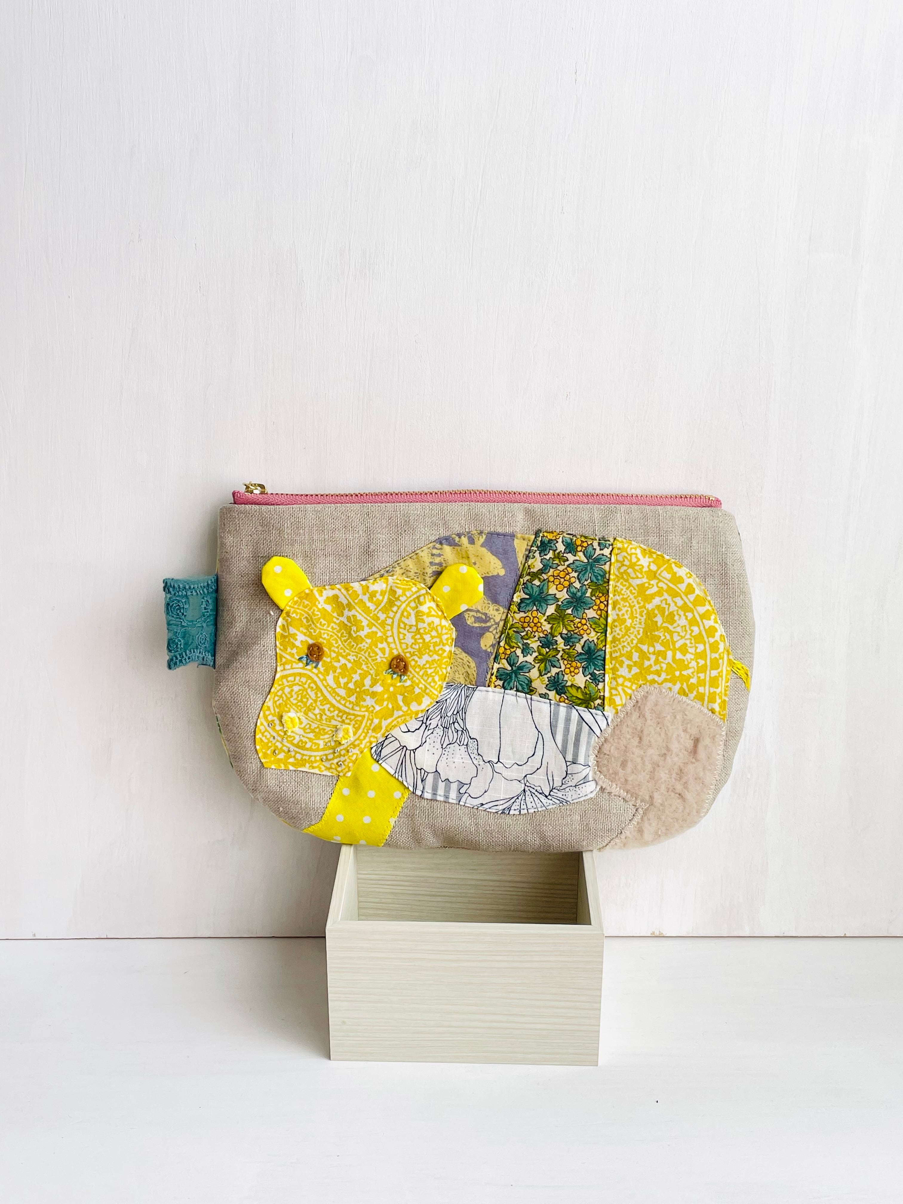 麻の生地に黄色のカバをパッチワークしました。